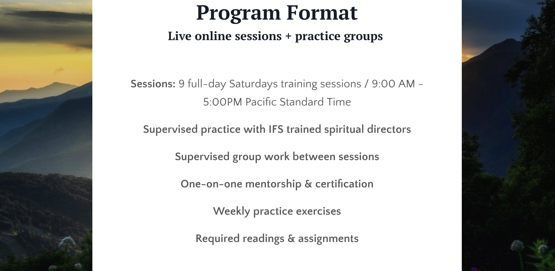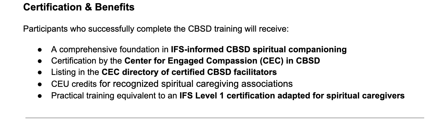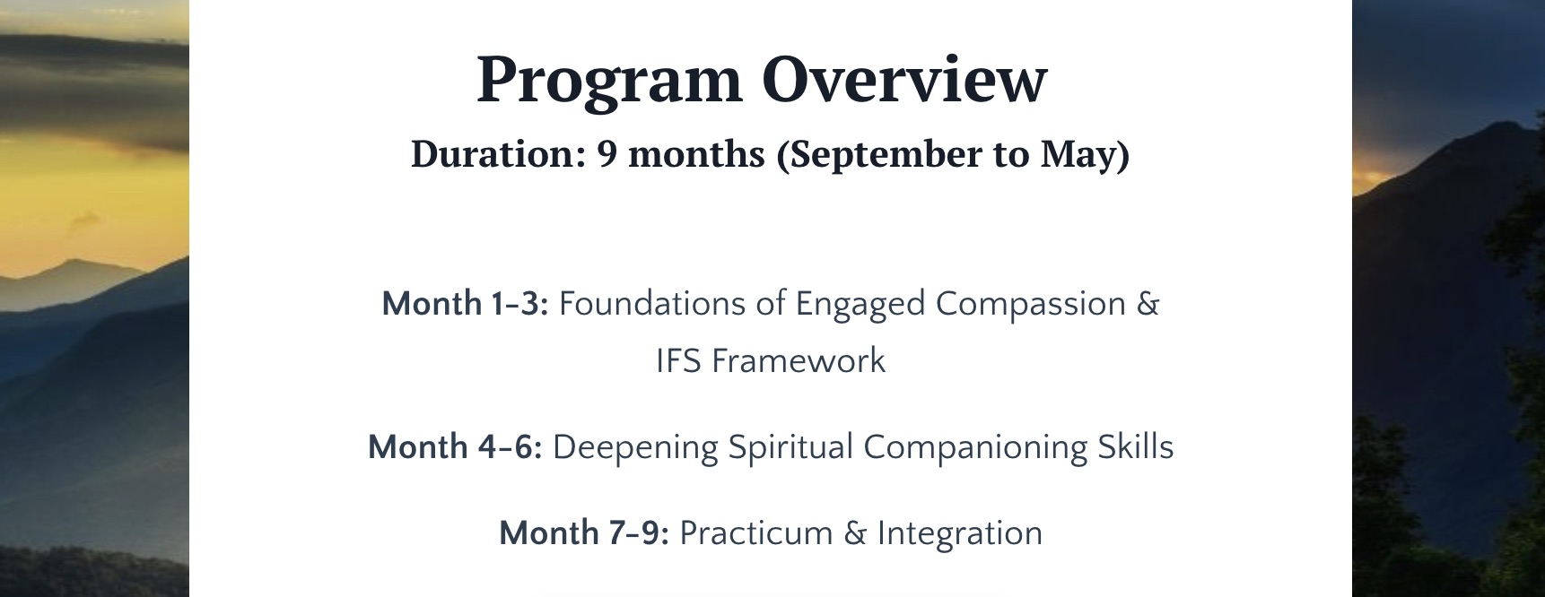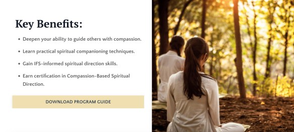 MJB-IFS is closely associated with Dr. Frank Rogers and The Center For Engaged Compassion (CFEC), and we highly recommend their newly-developed 9-month training program: Compassion-Based Spiritual Direction Training.In the past, spiritual directors who wanted to be trained in IFS needed to work directly with the IFS Institute to receive Level One training. In recent years, that organization, whose primary role is to work with counselors and therapists, has simply been overwhelmed with requests from spiritual directors desiring to be trained in IFS. That’s where Dr. Frank Rogers and The Center For Engaged Compassion comes in.Starting in the fall of 2025, CFEC will offer Compassion-Based Spiritual Direction Training – an immersive 9-month program in IFS Informed spiritual companioning. We, here at MJB-IFS, believe our Year One and Year Two cohorts are wonderful primers for those who want to go on and receive the equivalent of IFS Level One training, and we highly recommend this new CFEC program and encourage you to check it out today. Applications for the Fall 2025 program need to be in by August 15! So don’t delay!